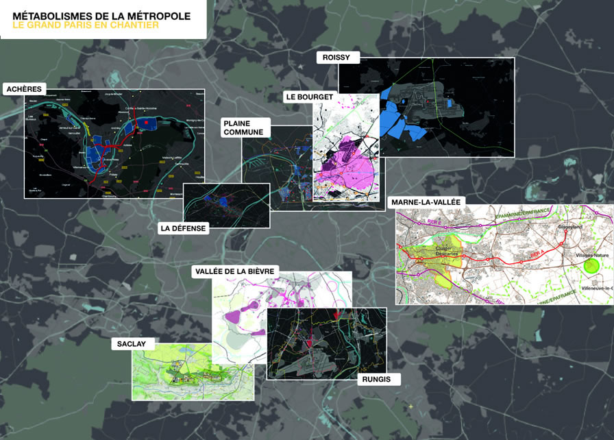 Ces travaux peu orthodoxes témoignent de pensées créatives globales et empiriques pourtant nécessaires pour entrer dans la complexité métropolitaine. Comment faciliter au public l'entrée dans ce jeu en 4D, dans cette navigation entre le territoire et ses représentations, et créer un outil partagé de communication et de débat ? Dans les années 1960, l'architecte Buckminster Fuller imaginait le World Game, un projet de cartographie interactive pour faire participer les acteurs du monde à des simulations du mouvement des ressources et des biens de l'espace industriel international. Les systèmes d'information géographiques, et les réseaux de communication désormais disponibles, offrent à travers des sites comme Google Maps® ou Openstreetmap les fonctionnalitées rêvées par Fuller. Depuis 2010, l'AIGP s'est engagé dans la production de cartes expérimentales utilisant ces supports. Pour les six premières soirées du cycle “Métabolismes de la métropole”, des cartes ont été conçues afin d'accompagner les débats. En se basant sur les données des intervenants, l'objectif était de construire un dispositif de communication intégré qui propose une visite guidée dans le métabolisme des territoires, mais soit aussi ouvert à la dérive dans le dédale de la photo aérienne et des “street-views”.
