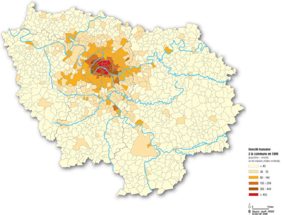 Densité humaine à la commune en 1999. Population + emplois sur les espaces urbains construits