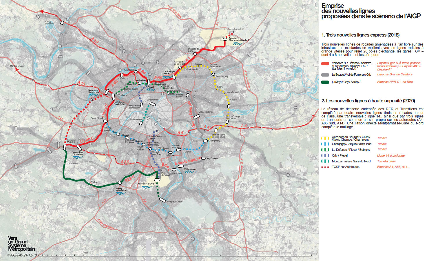 La possibilité de se déplacer librement, facilement et rapidement à travers le territoire métropolitain est une condition nécessaire mais pas suffisante pour réussir le Grand Paris. Le scénario proposé vise à articuler les réseaux de transport en commun repensés avec tous les autres modes de déplacement et toutes les vitesses dans un Grand Système Métropolitain. Ce système doit être à la fois prospectif et pouvoir être mis en œuvre sans tarder et à moindre coût